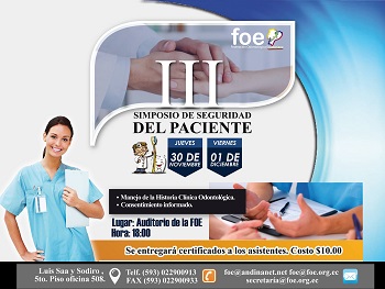 La Federación Odontológica Ecuatoriana FOE y el Colegio Odontológico de Tungurahua se encuentran ultimando detalles de lo que será el XLVI Congreso Odontológico Ecuatoriano, a realizarse en la ciudad de Baños, los días 16, 17 y 18 de noviembre del 2017, cita científica y gremial que convoca a todos los profesionales odontólogos y odontólogas del Ecuador y la región, en una de las ciudades turísticas más atractivas del país.